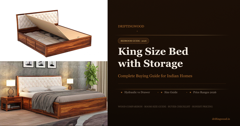 Buying a king size bed online in India is one of the biggest furniture decisions you'll make. This guide covers everything — the correct king size dimensions for Indian rooms, hydraulic storage vs drawer storage (and which one actually wins), why sheesham wood is the only sensible choice for Indian humidity, honest 2026 price ranges, and a complete checklist of what to verify before placing your order.