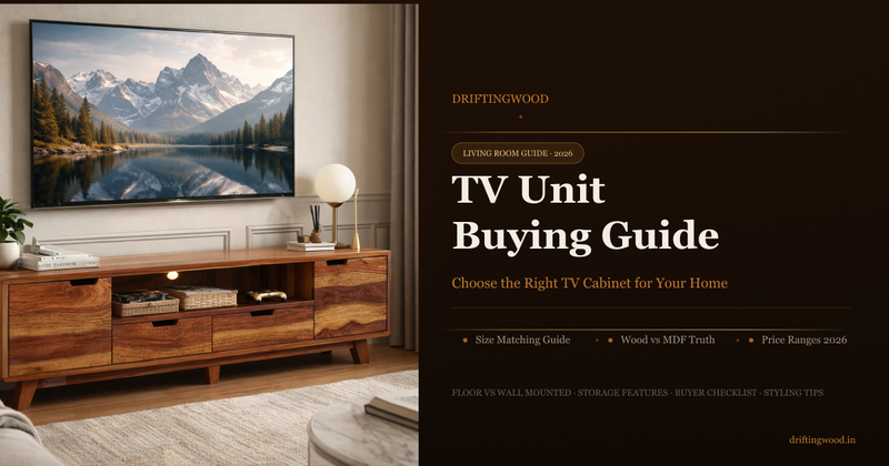 TV sizes, unit widths, floor vs wall-mounted, wood types, storage features, and honest price ranges — everything you need before buying a TV unit online in India.